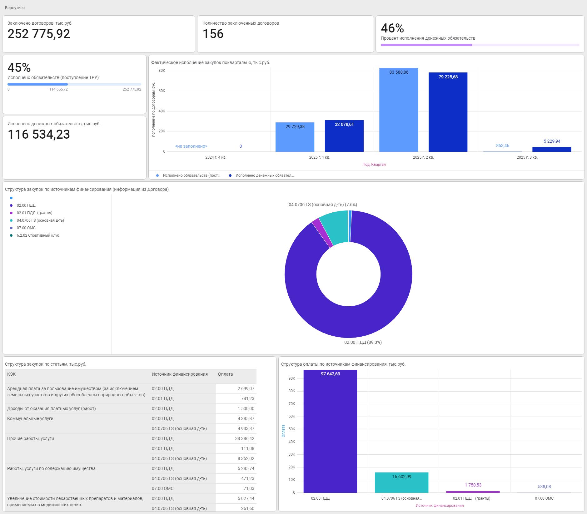 В разделе реализована возможность анализа закупочной деятельности ВУЗа. Сформированы основные отчеты по направлениям и видам закупок.